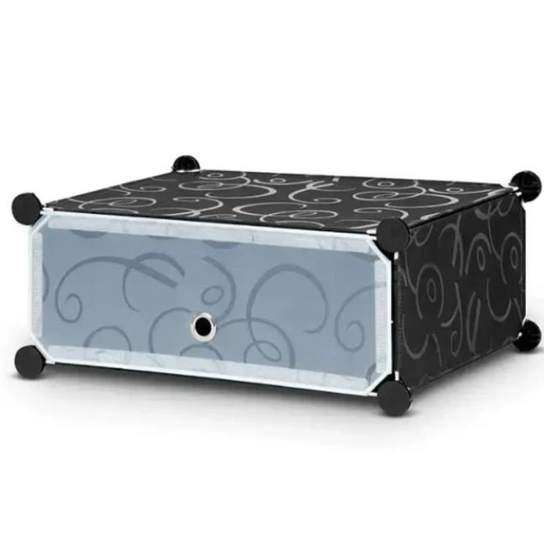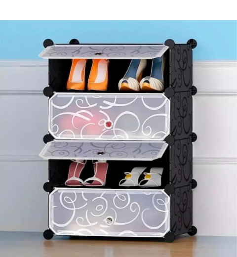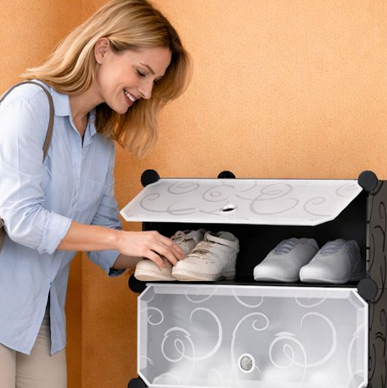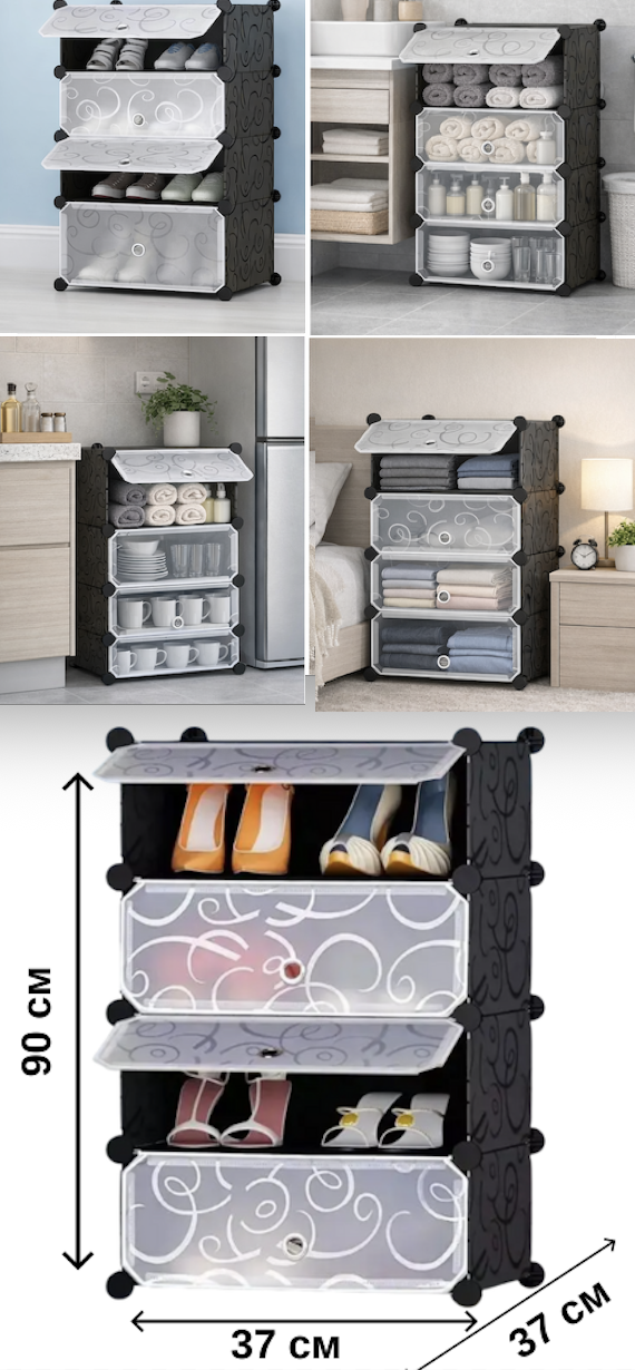 Міцний пластиковий корпус стійкий до вологи та забруднень, а прозорі дверцята дозволяють швидко знайти потрібну пару, не відкриваючи всі секції. Сучасний чорний колір з білими матовими елементами гармонійно вписується в будь-який інтер’єр.